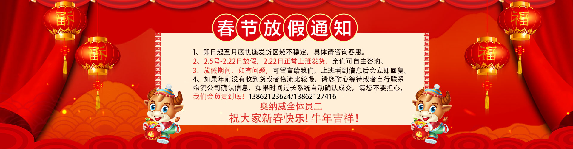 尊敬的客戶,您好,結合疫情進展情況以及本公司的政策,現(xiàn)將本公司2021年年假及春節(jié)放假安排:2021年2月5日---2021年2月19日(正月初八),放假期間安裝及售后暫停服務,業(yè)務咨詢正常溝通,感謝新老客戶在2020年對本公司的信任和大力支持,2021年將更加努力把最優(yōu)質的服務給到到客戶,放假期間聯(lián)系電話:13862123624,在此奧納威全體員工提前祝各位老板春節(jié)快樂,財源廣進!